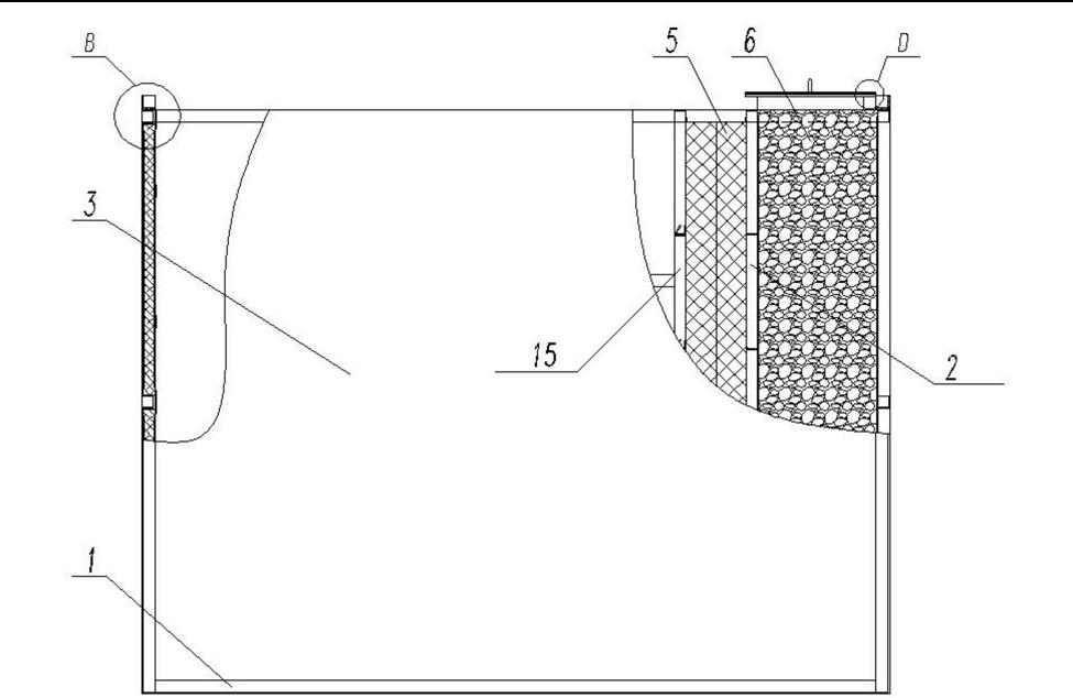 部設(shè)有除霧層和除沫層,液體在經(jīng)過(guò)除霧層和除沫層后能夠?qū)⒁后w中的霧氣和氣泡去除,所述除沫層設(shè)于除霧層的左側(cè),所述除沫層內(nèi)部設(shè)有絲網(wǎng)除沫器7,所述除霧層內(nèi)部包括板式除霧器5和除霧球6,所述板式除霧器5設(shè)于除霧球6的左側(cè),除霧球6與板式除霧器5之間設(shè)有隔離板一2,絲網(wǎng)除沫層5和除霧球6通過(guò)不同程度的除霧將液體中的霧氣去除,所述絲網(wǎng)除沫器7設(shè)于板式除霧器5的左側(cè),板式除霧器5和絲網(wǎng)除沫器7之間設(shè)有隔離板二15,所述噴淋段上殼體3的頂部設(shè)有通過(guò)螺栓組件4固定連接的兩塊除霧球封板9,除霧球封板9能夠防止在除霧過(guò)程中霧氣或者液體泄漏。值得注意的是,所述噴淋段上殼體3的四邊上設(shè)有等邊角鋼1,所述等邊角鋼1上設(shè)有安裝孔8,用于組件的固定和安裝。